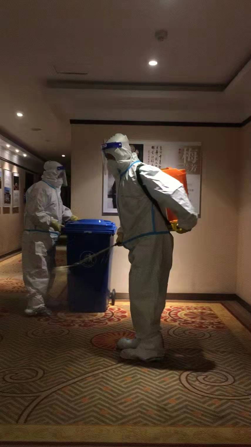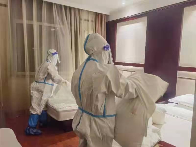 閉環(huán)服務(wù)期間,客房部員工面對疫情不畏懼不退縮,不計較個人得失,甚至有的同志帶病工作,卻仍然義無反顧堅守崗位,累計閉環(huán)54天。11月10日,入住西樓的84名醫(yī)護人員臨時通知撤離,由甘肅省人民醫(yī)院緊急抽調(diào)的101名醫(yī)護人員入住換防。當(dāng)時飯店其他員工都在居家辦公,客房部18位輪休人員第一時間主動請纓,努力說服家人,自主到社區(qū)辦理通行證后趕到飯店,投入緊張的客房和公共區(qū)域衛(wèi)生清掃與消殺工作,直到凌晨2點。在這個特殊的時刻,飯店客房部員工筑起了牢固的防疫堡壘,堅守著這個特殊的“戰(zhàn)場”,他們的默默奉獻與守護也成為了醫(yī)護人員眼中最可愛的“逆行者”。