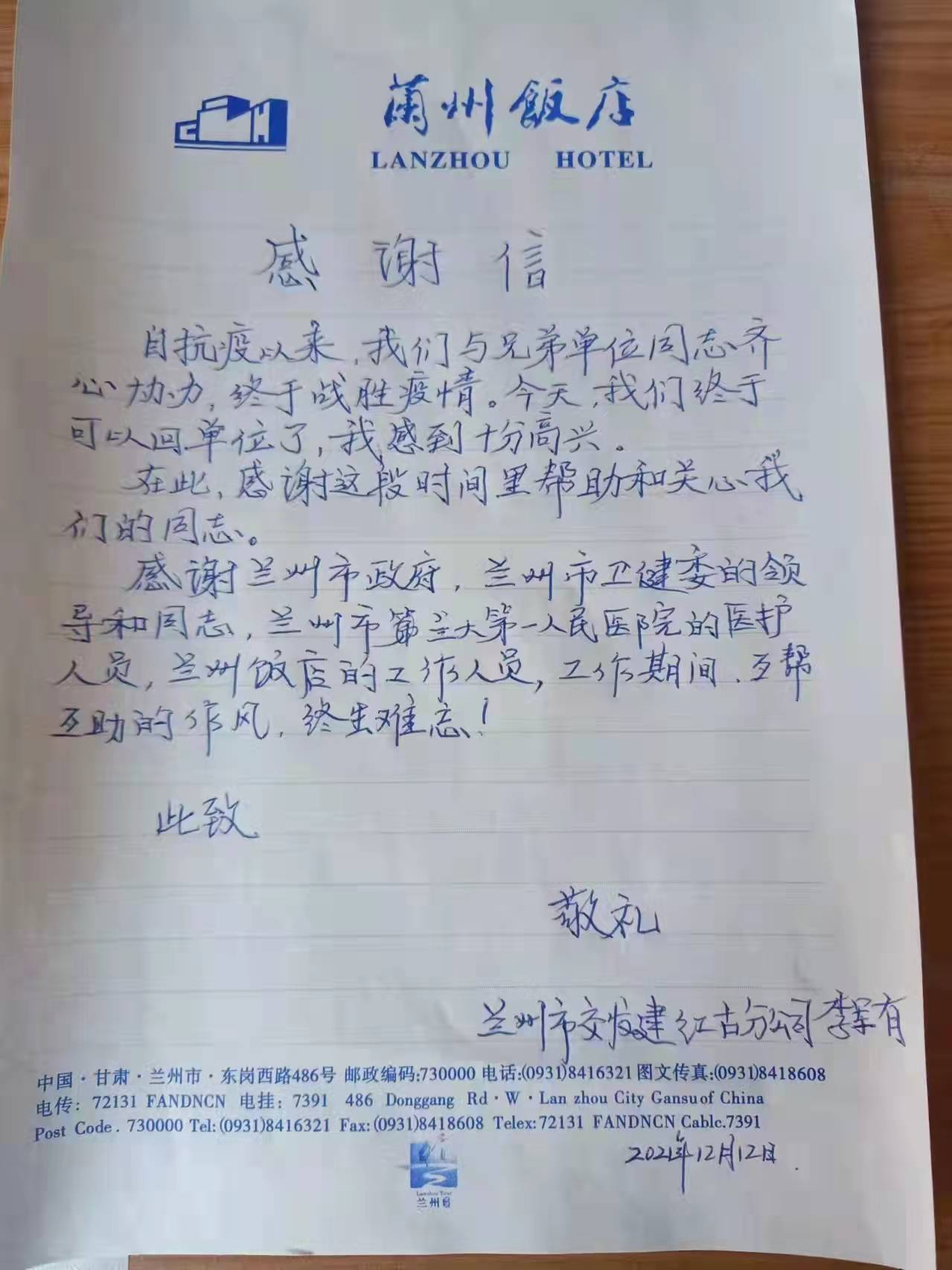 2021年10月19日,新冠肺炎疫情防控阻擊戰(zhàn)在蘭州打響。疫情當(dāng)前,蘭州飯店聞令而動,力擔(dān)重任,投身戰(zhàn)“疫”服務(wù)第一線。2022年1月13日,蘭州市城關(guān)區(qū)文旅局召開先進表彰大會,我店被評選為“抗擊新冠肺炎疫情杰出貢獻單位”。疫情面前,蘭州飯店的每一位管理者、每一個員工都是抗“疫”戰(zhàn)士,他們站得出、沖得上,在“大考”中勇毅擔(dān)當(dāng),向陽而行,彰顯使命擔(dān)當(dāng),做出了杰出貢獻。