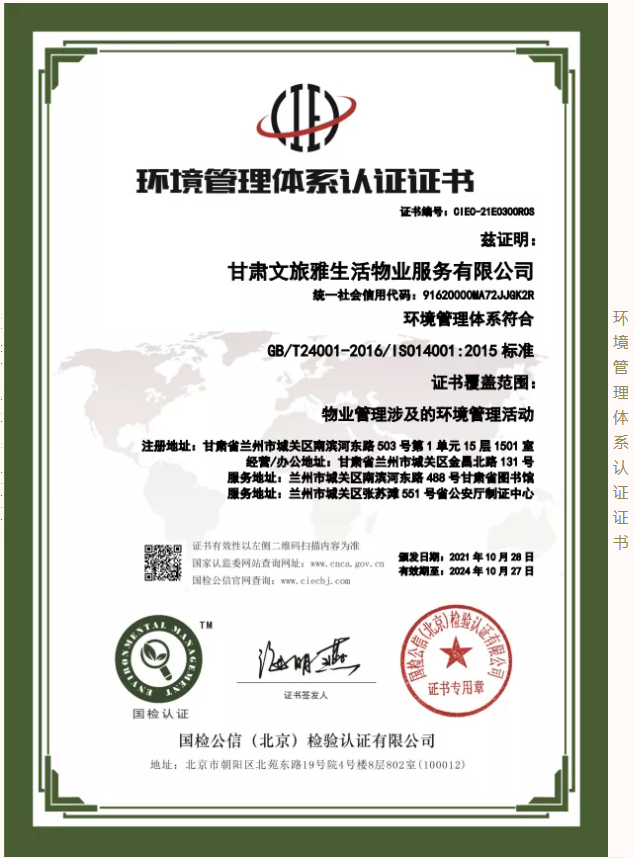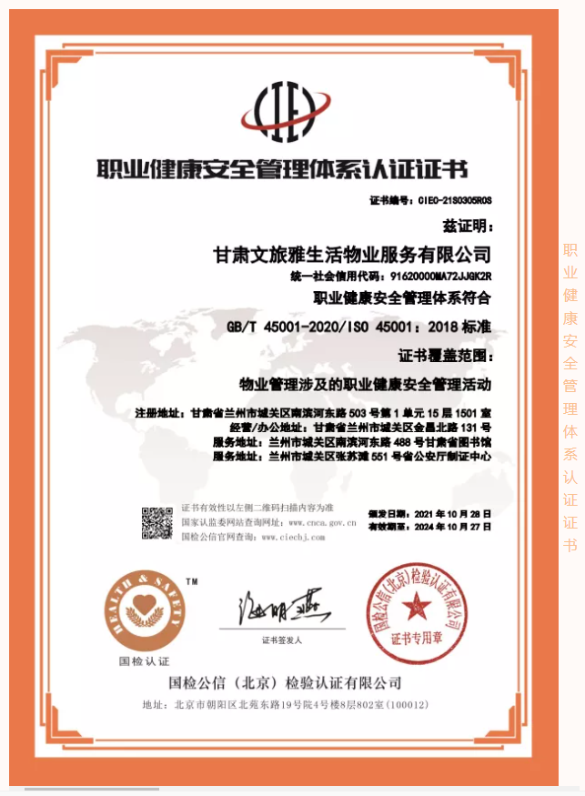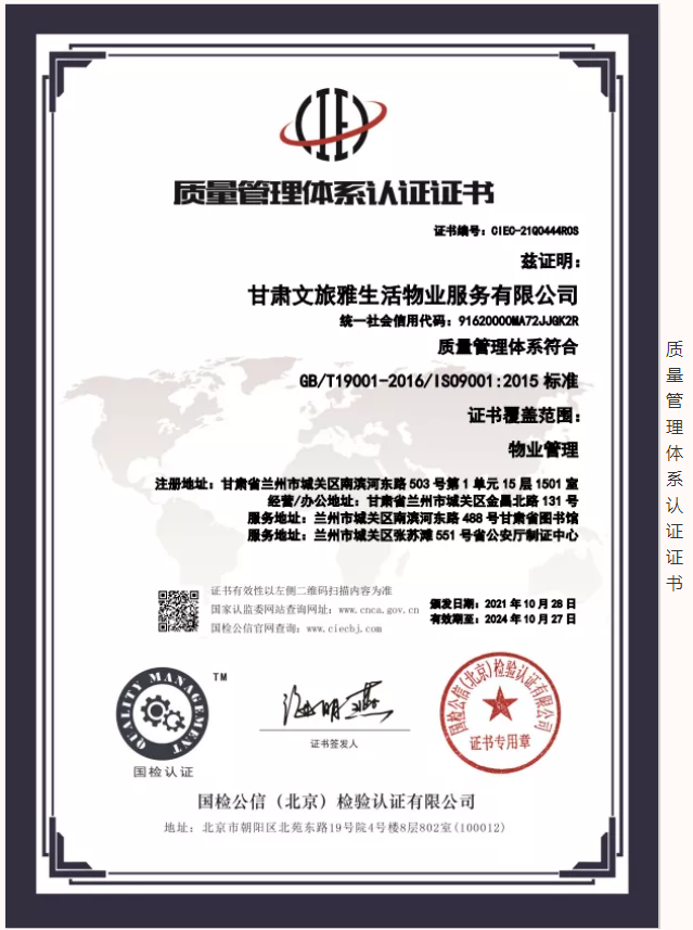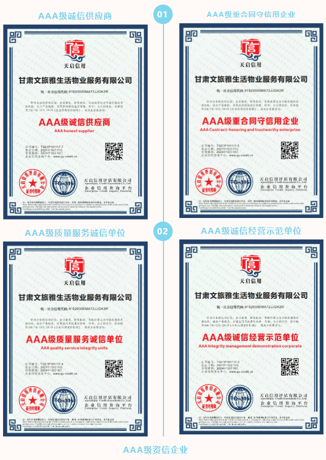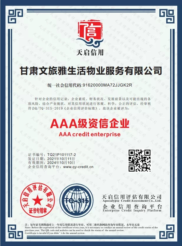 2021年,甘肅文旅雅生活物業(yè)服務有限公司認真貫徹落實習近平新時代中國特色社會主義思想,堅決落實集團公司各項決策部署。按照集團公司高質(zhì)量發(fā)展要求,結(jié)合自身發(fā)展需要,公司于9月份正式啟動3A體系認證工作,經(jīng)過權(quán)威認證機構(gòu)對公司信用管理、制度建設、管理體系等方面綜合評估,10月底公司順利通過3A體系認證,使得公司在管理水平、制度建設方面有了進一步完善及提升,增強了公司核心競爭力和品牌影響力,為公司高質(zhì)量發(fā)展奠定了堅實的基礎(chǔ)。