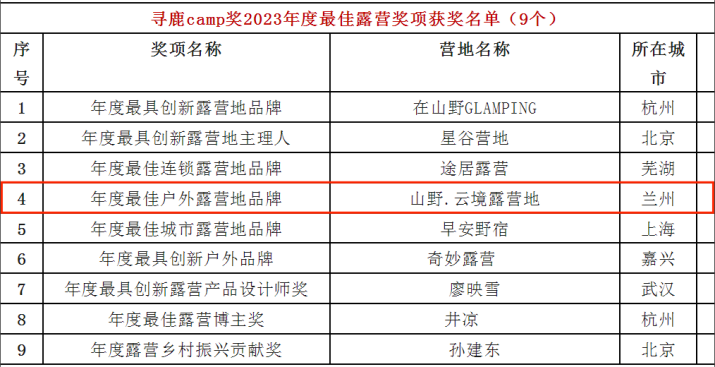 近日,中國旅游景區(qū)協(xié)會露營分會和中國車船協(xié)會房車露營分會指導(dǎo)支持的狐小旅首屆全國露營主理人大會暨2023“尋鹿CAMP”頒獎典禮在途居南通開沙島露營地舉行。甘肅文旅集團(tuán)旗下石佛溝國家森林公園山野云境露營地榮獲“首屆尋鹿CAMP獎2023年度最佳戶外露營地品牌獎”獎項。