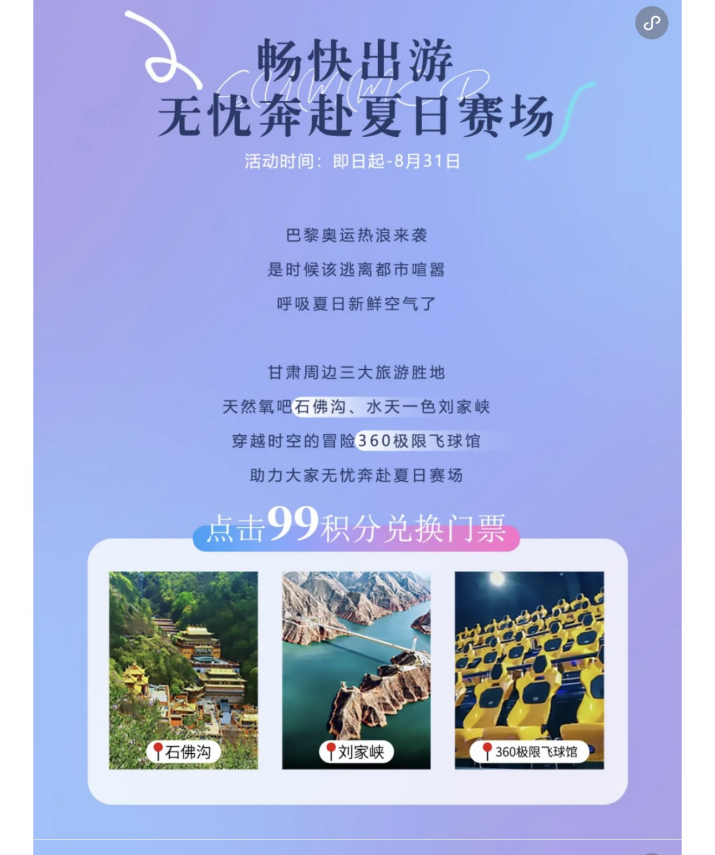 首期活動(dòng),運(yùn)營集團(tuán)精選蘭州石佛溝國家森林公園(國家AAAA級(jí)旅游景區(qū))、劉家峽恐龍國家地質(zhì)公園(國家AAAA級(jí)旅游景區(qū))及蘭山360極限飛球三家景區(qū)場(chǎng)館參與活動(dòng)。期間,吾悅廣場(chǎng)室內(nèi)外大屏也將滾動(dòng)播放景區(qū)場(chǎng)館的宣傳影片,供廣大消費(fèi)者了解景區(qū)場(chǎng)館詳細(xì)信息。后續(xù),運(yùn)營集團(tuán)將根據(jù)市場(chǎng)反饋與實(shí)際情況,不斷調(diào)整、更新活動(dòng)場(chǎng)館,為廣大消費(fèi)者帶來更加豐富多元、新鮮有趣的旅游體驗(yàn)。
